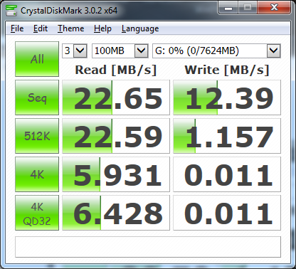 I've attached 3 images from various Crystal DiskMark tests I ran on microSD cards (Lexar Class 10, Patriot Class 10 and a SanDisk Class 4 all 8GB) using the internal card reader on my laptop. In my digital and video cameras, the two Class 10 cards worked well. In my Glo, they made it noticeably slower. I suspect this is due to the small block writes where the Class 4 SanDisk was 65 to 171 times faster. The similarity of the sequential read speeds is, I suspect, a limitation of the Ricoh chip used for the card reader. Regards, David Last edited by DNSB; 05-05-2013 at 02:46 AM. |