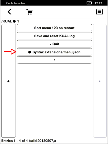 Click the KUAL sub-menu and get further details. Click the syntax button (#2) and see message "More info in KUAL.log" (#3). Now, this message should appear in the breadcrumb line (screen top) but instead it appears in the status line (screen bottom) where it's less visible. It's a bug, I will fix it and place the message back in the breadcrumb line. You want to see the log file, so click "Save and reset KUAL log" (#4) then quit KUAL and scroll to the document named KUAL-20yy-mm-etc. and open it. Mine's shown in #5. This is where it can get too technical for some people, but bear with me. That message means something's wrong with file /mnt/us/extensions/menu.json. You need to fix that file. (The actual file path will change depending on the contents of your extensions folder.) Open the file in your favorite editor, and find the spot where KUAL thinks there's an error. In this example KUAL's saying the it was expecting a value (like a string or a number) but found a closed square bracket instead. It also shows you where that happened, in this case the offending square bracket follows "bin/move.sh" } , Mmm... that dangling comma doesn't look right. Delete it (the comma), save menu.json and restart KAUL. Now the extension shows up! (#6) Last edited by stepk; 05-08-2013 at 09:19 AM. |