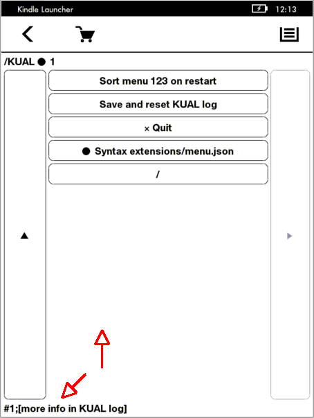 Click the KUAL sub-menu and get further details. Click the syntax button (#2) and see message "More info in KUAL.log" (#3). Now, this message should appear in the breadcrumb line (screen top) but instead it appears in the status line (screen bottom) where it's less visible. It's a bug, I will fix it and place the message back in the breadcrumb line. You want to see the log file, so click "Save and reset KUAL log" (#4) then quit KUAL and scroll to the document named KUAL-20yy-mm-etc. and open it. Mine's shown in #5. This is where it can get too technical for some people, but bear with me. That message means something's wrong with file /mnt/us/extensions/menu.json. You need to fix that file. (The actual file path will change depending on the contents of your extensions folder.) Open the file in your favorite editor, and find the spot where KUAL thinks there's an error. In this example KUAL's saying the it was expecting a value (like a string or a number) but found a closed square bracket instead. It also shows you where that happened, in this case the offending square bracket follows "bin/move.sh" } , Mmm... that dangling comma doesn't look right. Delete it (the comma), save menu.json and restart KAUL. Now the extension shows up! (#6) Last edited by stepk; 05-08-2013 at 09:19 AM. |