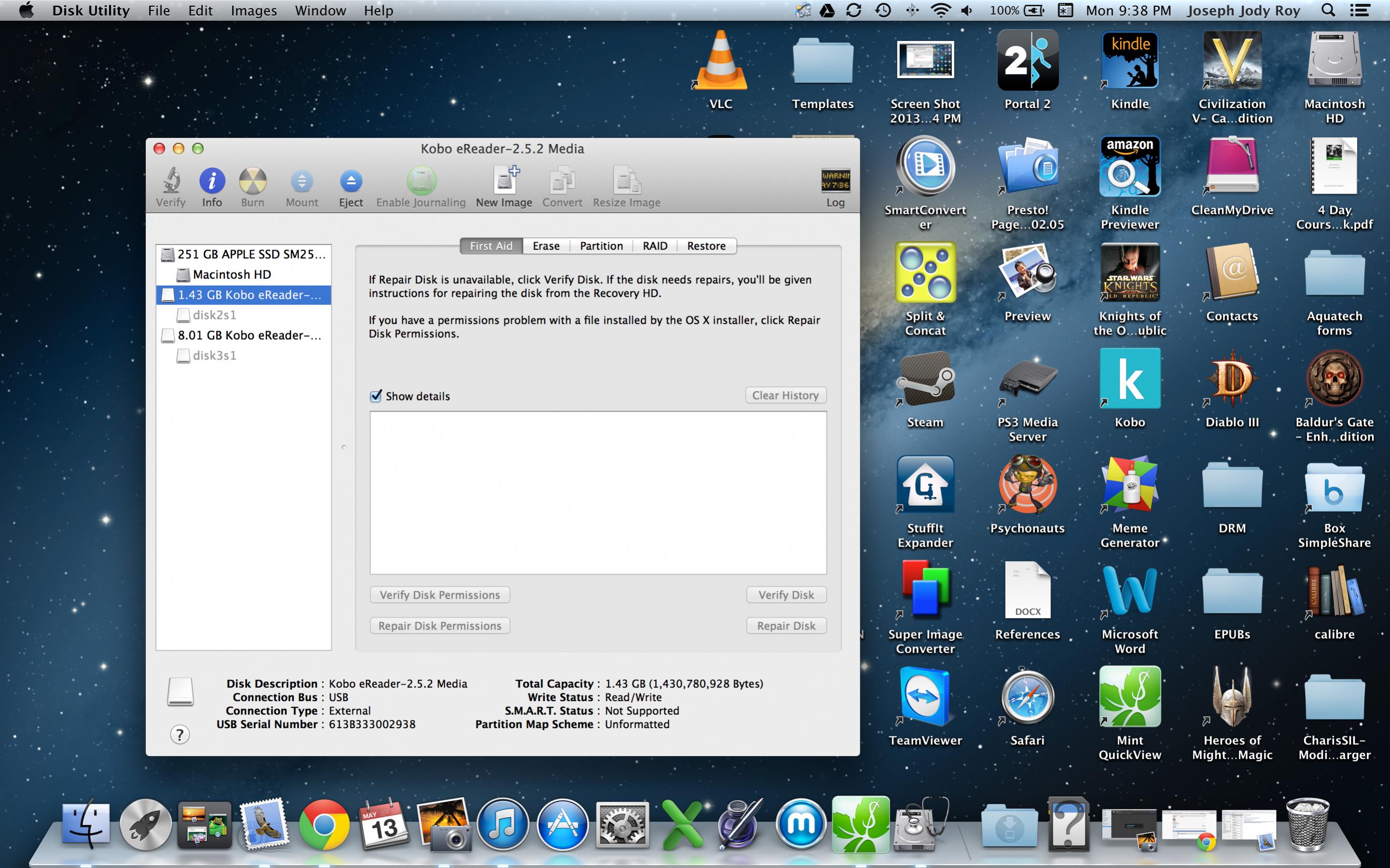 I took advantage of a sale at Best Buy (Free Sleepcover with a new Kobo Glo) and pulled the trigger. However, I am having issues getting my Kobo recognized by my Mac. When I connect it with a USB cable ( I have tried many different ones), My Mac (MBP 15" retina OSX 10.8.3) does not recognize it as a valid drive : "The file system is not readable."