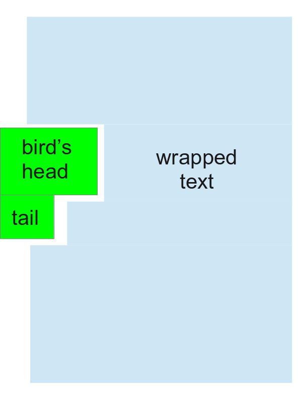From time to time, I bump on these kinds of things. I'd like to find a practical solution for this one: As you can see, It's a bird (head + tail) placed in the green area and standing on the left side of a page. My dream would be to know how to wrap the text around (intended light blue display). I even cut the bird in two pieces and tried to stick the pieces together but I failed miserably (it worked for one font-size, but increase it and the tail goes away... )Would somebody accept to publish here the relevant code? Last edited by roger64; 05-21-2013 at 07:17 AM. |