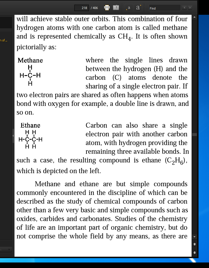 <p class="First6">where the single lines drawn between the hydrogen (H) and the carbon (C) atoms denote the sharing of a single electron pair. If two electron pairs are shared as often happens when atoms bond with oxygen for example, a double line is drawn, and so on.</p>
