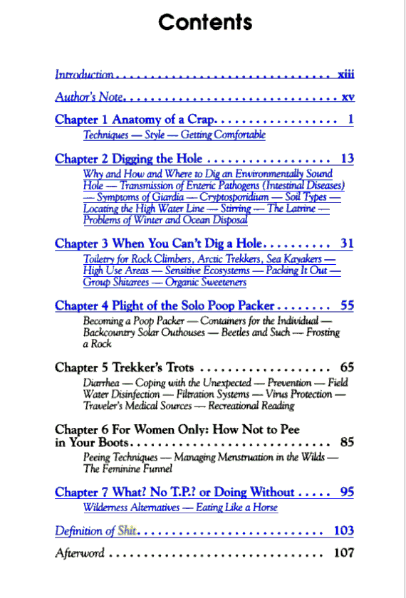 That's a great list of books, neko. I remember seeing How To Poop In The Woods (I'm paraphrasing the title) - a very useful and humorous description of what's required to avoid bacterial contamination of water in the wild. Imagine how it was when I described these as requirements to my wife. Oh, and the last chapter's great: no toilet paper? just eat like a horse.