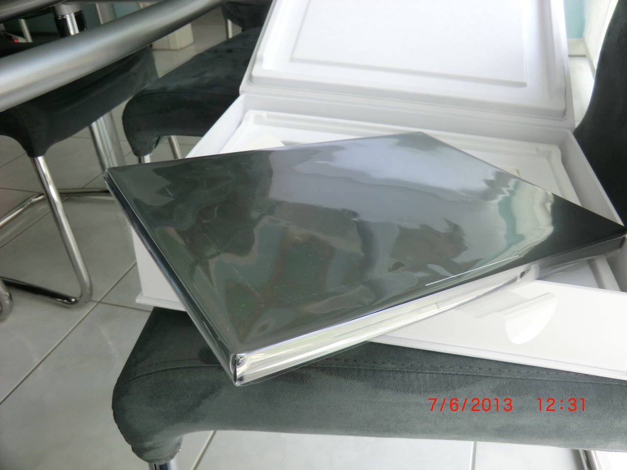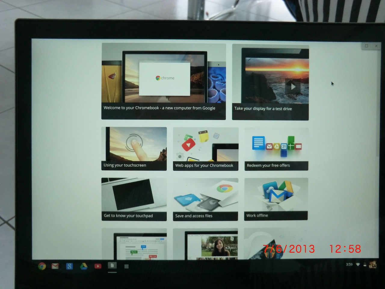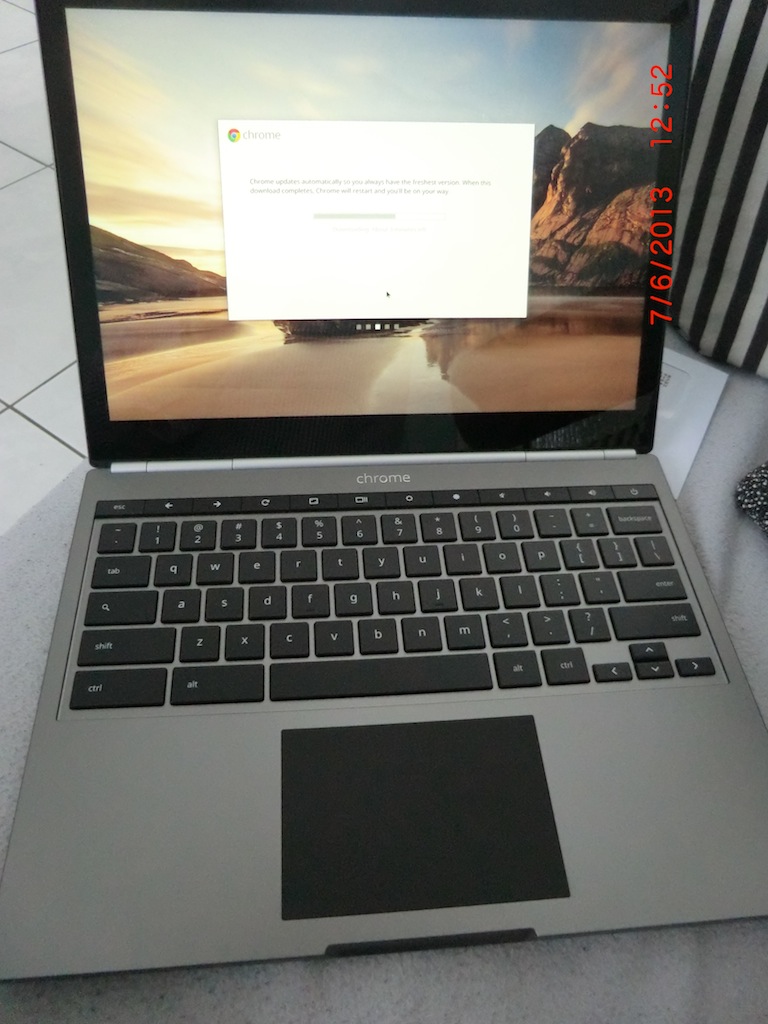 It was sent on Monday from San Francisco. Did get it on Friday. Pictures attached. The seller got it as a gift on Google's developer congress. You see it on the package: "For Development Purposes Only!". No problem for me, I knew that before. And so far, all units I've seen in eBay and the likes had been the same. I didn't find a way to buy directly from Google either. The box hadn't been sealed. The seller told me, that's the way Google has handed them out. But the Chromebook itself still is in its original shrink-wrap. Again: As expected and fine by me. I wouldn't have wanted it without shrinkwrap, though... Impressions: As I had hoped for: Not too bulky and extremely "valuable". I'd say, it's in the same class as Microsoft Surface Pro. No surprises, when booting for the very first time: Connecting to the web is the very first action and is core. It's downloading an update now. 8 minutes left... The display, as advertised, is great. I only see the download window and parts of the desktop background. But of course it blows my MacBook Air with it's meager 1366 x 768 out of the water. Design-wise I'd say it's great, but no "revolution" compared to my MacBook Air. No fan noise so far, but I'm only downloading the update now of course. Not that easy: I have MAC address filtering on my router. I know: Many consider it a stupid and easy crackable kind of protection. Anyway... How do I find the MAC address of my Chromebook Pixel? Hmmm... I found it: In the lower right corner, similar to Windows desktop, there's the symbol for WiFi. Here one finds "i" for info. Mac address and further details can be checked from there. Just briefly checked "Plants vs. Zombies". Wow! The speakers are really powerful. From the sporadic sound effects and the simple background music I can't really tell about the quality. But nothing to lament so far. Touch screen is working fine in "Plants vs. Zombies". I've read different reviews. Some claiming "single touch only", others praising the multi touch. I expect the latter, but I'll check. Edit: After having set the respective flag, I can pinch and zoom in the browser. So it can't be single touch. Whether it's 5 or 10 touches... The fan is relatively loud now. I'm only browsing the web, but I clearly can hear it. Surface Pro is quieter, MacBook Air as well. I'll track that. Checked the highly recommended flags (some kind of special settings). Important: Activate "pinch & zoom", else it's not present in the browser. Strange for a touch-enabled device. Working fine now, after setting the flag. My verdict for now: Great! Exactly as expected/hoped for. It definitely will be my main unit for surfing the web. Yes, it's not much different from using Chrome on Surface Pro, for example. Chromebook Pixel starts in less than 10 seconds, but Surface Pro is almost as fast. Maybe, when I have to travel light, I'll choose Surface Pro as my multi-purpose unit. But when I freely can choose at home, on the couch, Chromebook Pixel looks and feels great. I have a touch screen, but I have a full blown keyboard as well. And (one of) the best display around. Only potential issue I have to track: Fan noise. Maybe it's just because of the bad circulation now. I've put it directly on the couch. I'll check the fan noise, when putting it on a flat surface. Just redeemed my free 1TB Google Drive. Didn't work at first: "Your device is not eligible...". For whatever reason, suddenly it did work. Not essential for me, but for free of course I gladly take 1TB... Wow!!! The introduction offers "take your display for a test drive". It's the demo "Timescapes". Slow/motion and time-lapse cinematography. What a test drive this is! Speakers hidden below the keyboard, but surpsisingly powerful and clear! And the colors - just great. Absolutely nothing to complain. The fan more or less is constantly on. Not loud, but without any additional sounds you hear it. Even without load. Not annoying, but strange though. MacBook Air or Surface Pro sometimes get louder than what I hear now on Chromebook Pixel. But they can be entirely quiet as well, whereas Chromebook Pixel seems to have the fan constantly on. EDIT: The fan is not constantly on. Chromebook Pixel sits next to me, while typing this on my MacBook Air. No load = no fan noise. The fan starts rather quickly, but not without any load at all. What's pretty obvious: Google -what a surprise- seems smarter/more experienced re. advertising/marketing. When using Surface Pro for the first time, you struggle a bit (where/how can I search for apps in the store?). You go through the help sites and eventually you find it all. And then Surface Pro respectively Windows 8 are a pleasant surprise. Google, for starters, has prepared kind of a "beginner's portal" (last 2 pictures). Here you find impressive demos and tips. No biggy, after 1 or 2 hours of testing it won't matter anymore. But it's a different approach and makes for quite a difference in the first 20 minutes or so. Again: Imagine the branding of Apple, the marketing of Google and the software capabilities of Microsoft, bundled in a single product... Interesting: As so often, I did a hard reset after some time. I didn't find a way to get rid of the 2nd user account I had activated. I didn't have to repeat the update after the hard reset. Most units you really reset to the stone ages. Here obviously the update is flashed and conserved. Nice! There doesn't seem to be any auto-brightness, just 16 manual steps. The display is phantastic inside the house. Outside, in direct sunlight the usual of course - but I've seen worse. I have no idea, how (or whether at all?) I could use my surfstick. But my MiFi is working fine of course. EDIT: Only a snapshot of course after just 1 day of usage. But so far, battery duration seems to be ca. 4 hours under full load. Full charge takes ca. 3 hours. Just briefly testet an MP4 file: Tintin. The display is great of course. But the real surprise are the speakers: Very crisp and extremely