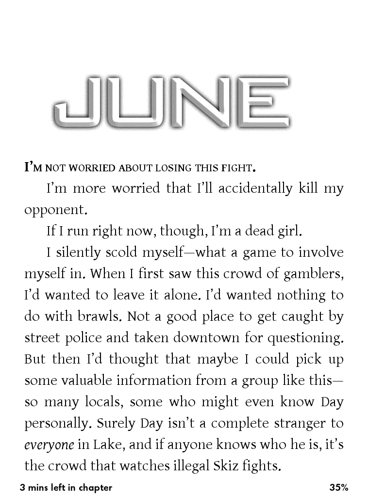 The Kindle book I got from Amazon has two different fonts. Let me mention that, the chapters of the ebook are either titled 'Day' or 'June'. The text of the 'June' chapters are in a font that I have chosen as my default, but the chapters entitled 'Day' have another font, it's really bold and I find it distracting, I prefer to read in a light font but I can't seem to change it.