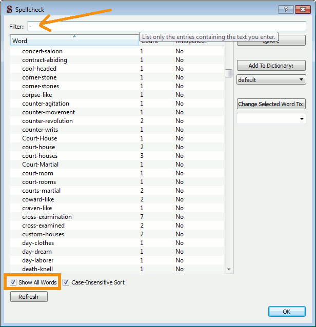 -</p>\s+<p> A faster way might be to use the above search and replace with a hyphen. Then go through your typical "hyphenation search" pass and fix any unneeded hyphens. I personally replace one by one just so I can double check with the PDF that a chunk of text is not missing (Most of my work is from PDF -> EPUB). To clean up hyphens throughout the text, I use the Spellcheck function in Sigil (Tools - Spellcheck - Spellcheck (Alt+Q)). This will give you a list of every word in the book. I then insert a hyphen in the search box (See attached image). Then I go look at the list of words with hyphens and remove them if needed. I do one pass with "Show All Words", then a pass with it unchecked (to show only words Sigil think is misspelled). And then maybe one more pass with "Show All Words" checked. In my case, these 2 or 3 passes usually catch almost all hyphenation errors throughout the book. |