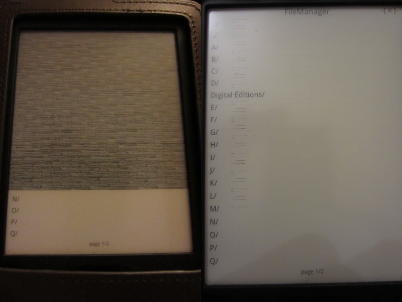 Mine is a single page listing of the authors folders that calibre placed on my Aura. It appears to have them all, but I only have a few on the device, while I am trying different things. If I have to reset the internal memory, I don't want to reload more than I need for immediate use. The corruption is there as has been described, but more to the point nothing appears to be being selected. The [X] in the upper right corner isn't being selected and no action is taken. To get out of that nonfunctional display, I have to plug in the USB cable connected to my PC and poweroff. Just using the poweroff doesn't work. Luck; Ken |