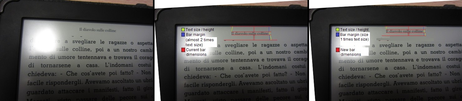 One of the most debated issues is the presence and the actual size of the information bars at the top and bottom of the screen in reading mode.
