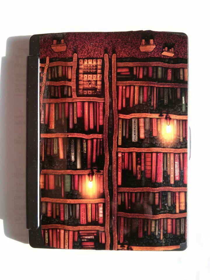 Plus, I like some of the designs. Here's the "Library" skin on the back of the sleep cover. Chopped down from an iPad one (and with the photo upside down)...