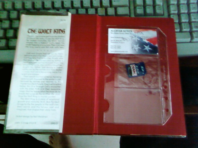 It took a bit of playing to get it to fit well. It is actually pretty snug. I realized that pulling it out by the notch that I cut for the power button might put too much torque on it and could possibly break the substrate in the screen. I added a piece of ribbon that lays under the Reader to allow ease of removal. I retained the first few pages so that it did still look more like a pbook. I also double-sided taped business card windows from a planner into the front cover to hold memory cards and the like. Since then, I found some self-adhesive pockets made for 3.5" diskettes on clearance at Office Depot for about $1 for a pack of 5. These also work well for card storage. |
