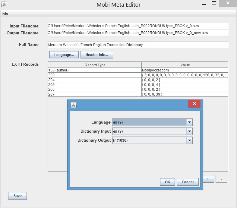 The input and output languages are indeed correct for the MobiPocket 1932-35 Academie Francaise dictionary. However the problem with the Merriam Webster French-English and Spanish-English translation dictionaries is that the input and output languages are reversed, as shown in the attached image. These input and output languages are the same as the corresponding English-French and English-Spanish dictionaries, and so correct in the English-* dictionaries but wrong for the *-English ones. I can use the editor to correct these settings, but the corrected file is then not recognised when uploaded to the Kindle. I guess that this is because the file is protected against tampering by a CRC calculation. |