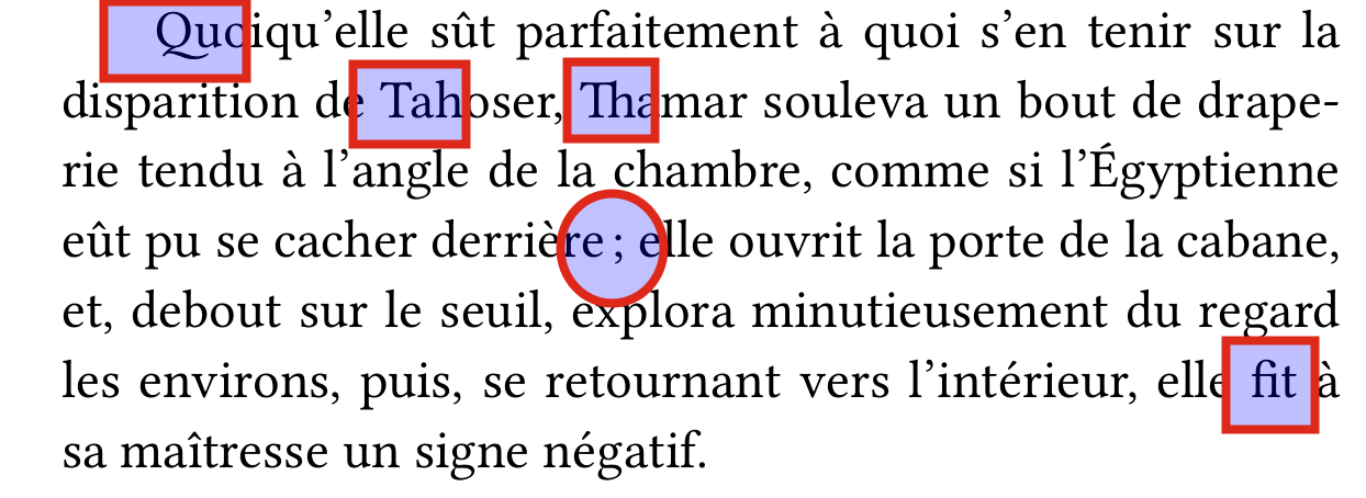 Il en faut aussi après les — de dialogues (ou au moins des espaces non-justifiantes). Autrement, on peut facilement avoir quelque chose comme : —*Bla —**Bla**bla**bla (* -> espace) et les deux B non alignés font assez moche. Last edited by Eric Muller; 08-09-2013 at 01:36 PM. |