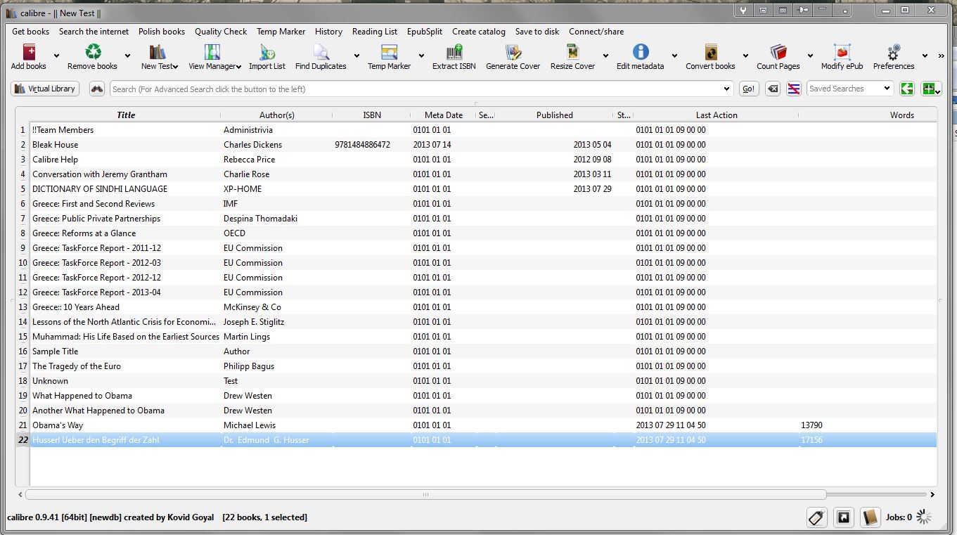 Start Calibre - seems to be snappier when it gets to the screen display steps, I see three transitions. Not noticeably faster in getting to that stage. But Calibre start times have never been an issue for me - anything that starts faster than firefox is a bonus ![]() Problems 1. Custom Dates that were Undefined are displayed in their spreadsheet cells as "0101 01 01 09 00 00", previously they displayed an empty cell. Format for these dates is "yyyy MM dd hh mm ss" 2. Find Duplicates Right arrow ALWAYS throws this error (not a crash) Code: