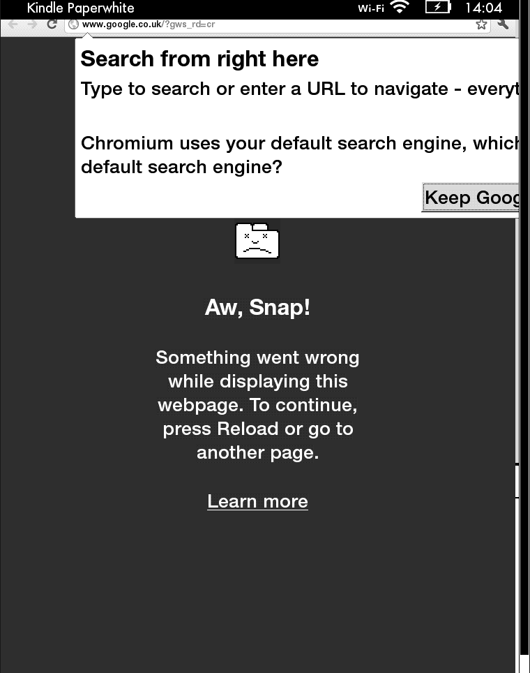 Let me see if I can get this thing to a screenshottable state. GDK_PIXBUF_MODULE_FILE="/mnt/us/extensions/system/lib/armv7l/gdk-pixbuf-2.0/2.10.0/loaders.cache" chromium-browser --temp-profile http://google.com Yeah so with a bit of love (and more skills than me) That could probably be made usable Seems like the only error left is: Quote: