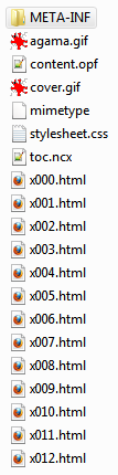 As well as the features I've already alluded to it does a few other things: (1) All the _split_nnn.html files get renamed; (2) an externally prepared cover image and logo are copied into the book; (3) page_styles.css is removed from the xhtml files and an externally prepared stylesheet.css is copied into the book; (4) the long string IDs in toc.ncx are replaced with simple IDs of "P" followed by the playorder number; (5) in the xhtml files it replaces "Unknown" in <title>Unknown</title> with the actual book title. Attached image shows list of files in a typical ePub after processing. Last edited by Agama; 08-12-2013 at 05:29 AM. |