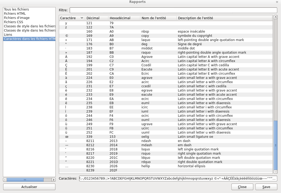 Tools - Reports - Characters in HTML Files. Currently, this report correctly goes from HTML entity names/decimal/hexadecimal and actual characters -> the report. What it does not do, is go the opposite. When double clicking on a character in the report, it brings you to the next instance of only the actual character, but it does not find named/decimal/hexadecimal instances. I attached an image showing how clicking on 'ô' does not lead to "ô" in the HTML file. Tools - Reports - Links While clicking on a link in this report, you would expect it to lead you directly to the location. Instead, it seems to only open up the HTML file in which the link occurs. From there, you have to manually search for the link. Entity -> Character + Character -> Entity Also, a nice thing to have added might be a setting for Sigil to automatically go from entity (names/decimal/hexadecimal) -> character, character -> entity (names/decimal/hexadecimal).... currently, I am doing this the slow way by mass running a huge batch of Saved Searches. |