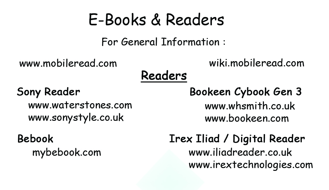Just today, I've talked to over half a dozen people about E-book and E-book readers, and in most cases ended up writing down more then a few web addresses but the main one for each MobileRead.com It was fun talking to people, most who had not seen a reader in the flesh before, others who had seen the sony but did not know about others. Another who collects Star Wars books, and was quiet interested in e-books in general and getting a hold of books published in America first ![]() It did bring up a curious point that I'm usually writing down half a dozen web addresses on any piece of paper handy. The sites I usually jolt down are www.mobileread.com wiki.mobileread.com www.fictionwise.com www.booksonboard.com www.mobipocket.com If looking to buy some of the others, for the Sony just head to the local Waterstones For the Gen 3 lately www.whsmith.co.uk usually www.bookeen.com I Figure I should print out a few cards on sheet of card stock, with all these addresses on it. Anyone got any more suggestions on sites I could / should include. ps. And I just realised why I've been trying to avoid going into bookstores lately. My willpower goes out of the window when I go into one. I'd just popped into Waterstones to have look at the 505 in person only, I ended up walking out with a book, I KNEW was £4 cheaper on Amazon but I wanted it now dangit .
