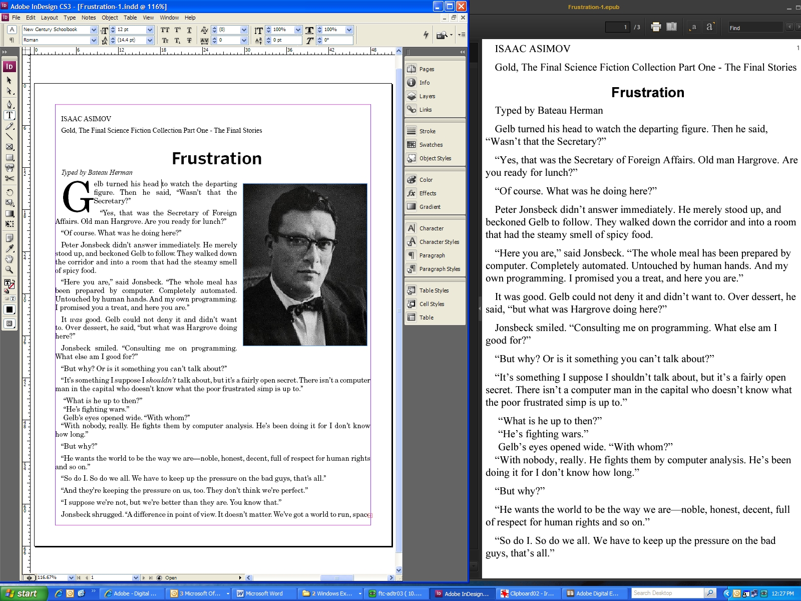 Funny, the epub looks remarkably like the original Word document I imported into InDesign, before I started playing. Seems to be a rather unnecessarily pricey word-to-epub converter. Even the "how to use indesign" books say "you might want to not bother so much with epub - it's not a very complete standard, producing unexpected results". No kidding. In case nobody noticed, Quark's .lit converter was terrible - even worse than this. It would be nice to be able to use a real pagination program (like Quark or InDesign) to produce ebooks - after all, that's what's usually used to produce real books. Until then: Epub is better because.....?????? -bjc |