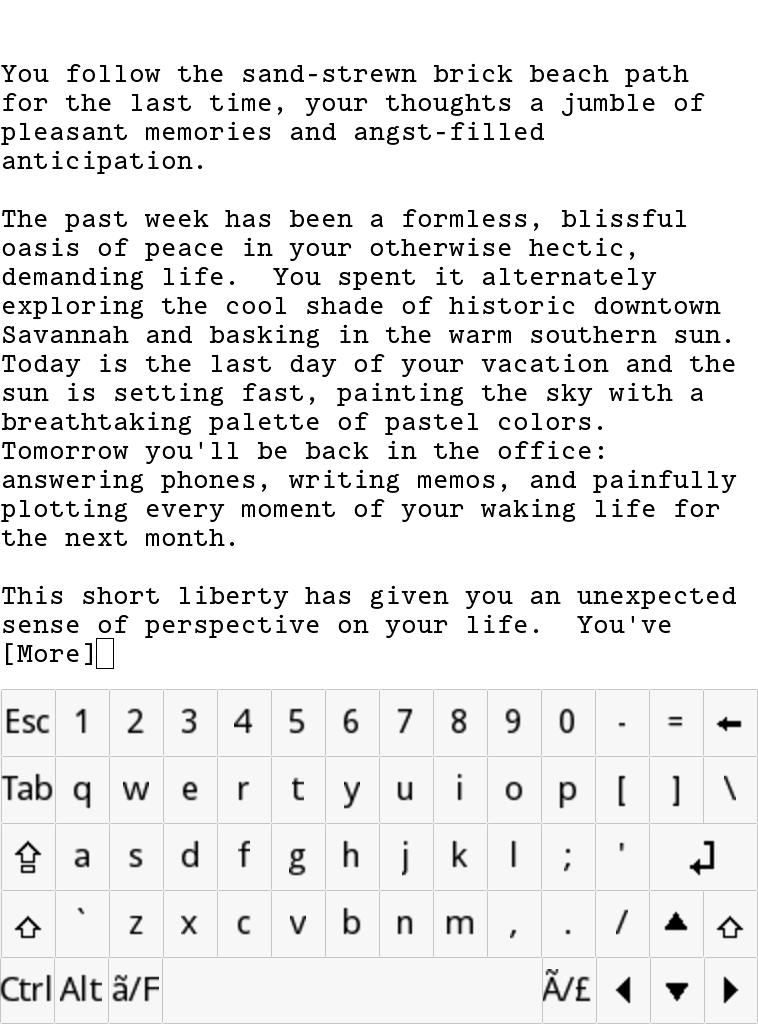 You have to wonder with the new Interpreter port if there might be a chance of a renaissance for IF games. I mean the first IF games for computers had to run on machines with only 16k of memory and of course those 1st home computers were virtual dinosaurs in terms of portability compared to an ereader like the Kindle. So perhaps IF games might make a come back. There are after all already CYOA book type games available so why not IF games as well?
