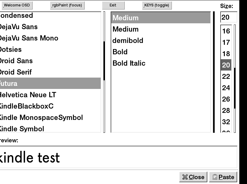 Nicely done - had a busy weekend so I didn't get to try rgbpaint yet, I was just trying to see if anyone else had a better idea. Thanks for the ideas so far. I'd also like to see it fullscreen, not sure how to do that? I still never tried to compile anything for the Kindle... This would be a great time to learn, I'm sure!