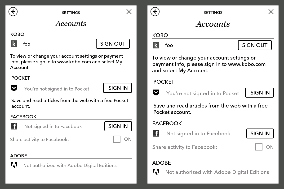Yes, I do. Since in 2.8.1 much of the relevant data is compressed, it has become a little bit more difficult to do. Immediately after the release of 2.8.1, I made a minimal bad-eyes-version for Touch (I changed only the size of menus, dictionary and annotations, since those data are still not compressed and are therefore easy to deal with). Yesterday night, I had another look into it. I think I am able now to handle the compressed data too. At the moment, I don't know exactly how to go about it in detail in order to make it easily usable. Maybe, I could produce a configuration file for matazoa's patcher. A problem is that metazoa's patcher only deals with libnickel, but we need to change nickel too. Another problem is, that I only have a Touch. This makes it difficult to know, whether what I do has the intended effect on other devices, especially since the Touch and Mini on the on hand, and the Glo and Aura (HD) on the other seem to drift apart more and more concerning the user interface. [On a side note, I did not get any feedback telling how the 2.6.1 patch worked for Glo and Aura. Therefore, it is not easy to continue working on that branch] If both are for the same FW version [for the time being this can only be 2.6.1], there should not be any problem, I guess. Changing the font size of the setting screens is especially difficult. The reason is, that these screens tend to be crowded and thee positions of the elements are fixed. Increasing the font size leads therefore easily to overlapping elements. |