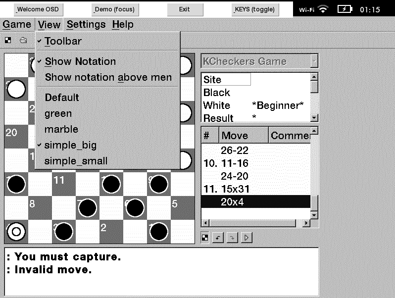 using the unreleased "fronter" to patch around naming issues. KCheckers also works well via this method. |