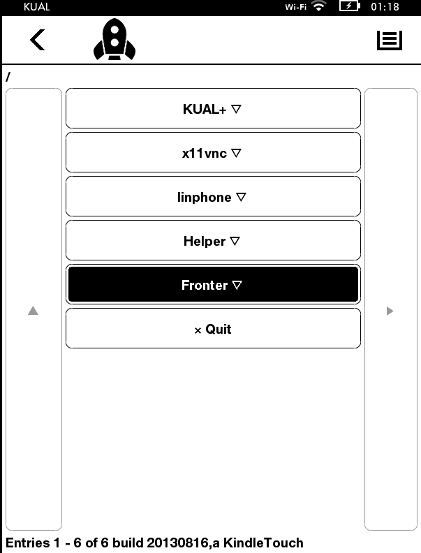 no ETCL for now on the paperwhite but you can exit via power button press. removed etcl Will think about creating something generic (Gtk?) that gives us a couple of nice overlay buttons? or to rethink the problem... Either way. I'll try to tidy up and repack. It's still a bit of a mess. Last edited by twobob; 09-05-2013 at 11:29 AM. |