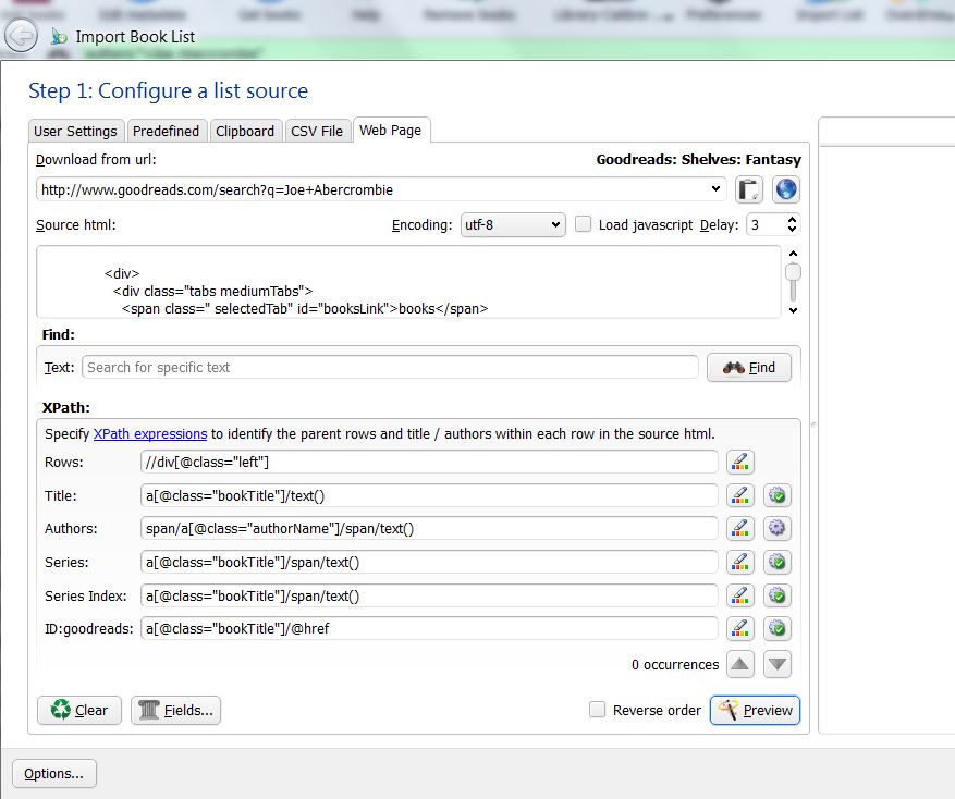 example using your original Joe Abercrombie example, but with Goodreads: 1. Selected Joe Abercrombie book in my calibre 2. Used Search the Internet for Goodreads by Author URL is: http://www.goodreads.com/search?q=Joe+Abercrombie note page lists 1-19 of 29 results 3. Opened Import List 4. on Predefined tab, selected Goodreads Shelves: Fantasy then clicked Edit 5. Copy and paste above URL into Web Page, Download from url: and then click Preview 6. That's it. Just sits there... ??? No books shown and the Next button never highlighted. Source info seems logical, xpaths are prefilled in ... What am I doing wrong? Last edited by Tom SKP; 09-23-2013 at 06:24 PM. |