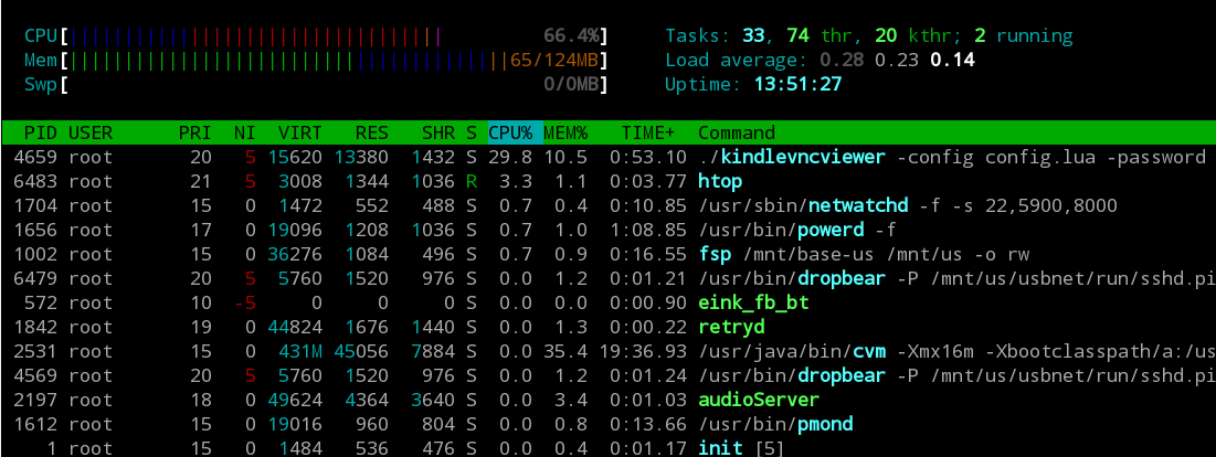 The following in response to twobob's PM -- some metrics: I'm connected via usb, RNDIS/Ethernet Gadget. I first ssh'ed into the kindle; then ran vnc. I ran htop (I had actually assumed that there'd be no sort of 'top' on the machine!); some results: CPU usage: While scrolling a pdf at normal reading speed, CPU usage is around 40-50%. Scrolling faster, it climbs to 80%. A moderate typing speed with nothing else moving on the screen uses about 60-70%. kindlevncviewer accounts for the cpu usage almost exclusively. MEM usage: 64 out of 124MB appears full; this hasn't changed at all in about an hour. Before that (when I first ran htop, after a session of maybe 8 hours) it was around 90MB, I think. kindlevncviewer uses 4.3% of the memory. The rest appears to be claimed almost exclusively by a certain cluster of processes starting with 'CVM', launched like this: /usr/java/bin/cvm -Xmx16m -Xgc:youngGen=1m -Dsun.awt.exception.handler=com.amazon.ebook.framew ork.impl.device.event.EventDispatchThreadException Handler -Xbootclasspath/a:/usr/java/lib/localedata.jar:/usr/java/lib/charsets.jar -Dsun.boot.library.path=/usr/java/lib -cp :/opt/amazon/ebook/lib/JFEP-0.1.0.jar:/opt/amazon/ebook/lib/journal-update.jar:/opt/amazon/...........and a whole bunch of other java thingies. Also -- 'fsp' runs with the following options: fsp /mnt/base-us /mnt/us -o rw,nosuid,nodev,noatime,max_write=65536,max_readah ead=65536 Also -- launchpad is running, though it's not using any resources. Perhaps relevant -- I'm on OS X 10.8.4; the screen is set to greyscale; the display is the 1680x1050 version; vnc shows the upper left hand corner (I arrange the windows accordingly.) It's embarrassing that I have to ask this, but I'm not sure how to extract information from the xterm window, aside from this somewhat qualitative description. |