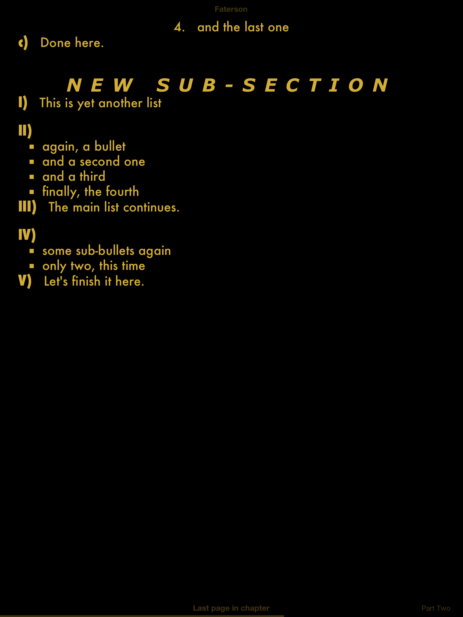 (PS: When I say it's "my" EPUB test file I don't mean it's my code... It's a random dilapidated file I found somewhere years ago, full of fake bulleted lists and all, and this year I proceeded to cram every possible formatting feature into it, to see how Marvin would do with the file compared to Stanza, my previous preferred iOS e-reader. Stanza is still winning at this point, in terms of the display of this particular EPUB file, although it gets many things in it wrong, too.) |