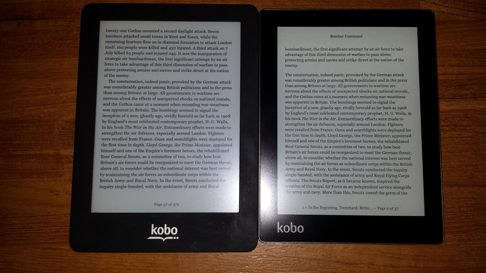 Nice size. The back is no longer the rubbery stuff, but hard plastic. Feels grippy enough, though. The screen is flush and that's really wonderful. No more crumbs in the corners. No more fidgeting when trying to select something close to the bezel. With light turned off and at 100% the Aura's screen is a bit more yellow than the Glo's. It doesn't show on the pictures I attached, though. With light at 100% there is a very pronounced white line at the top of the screen of the Aura (even the picture shows it). The Glo has it too, but much less pronounced (I'd never noticed it). Also, on the left and right side there is a greyish area on the Aura (about 3 mm thick), which the Glo doesn't have. The bottomside of the Glo has a grey line with 2 "bulbs"; on the Aura it's more even without the bulbs. I like the power button sticking out just a bit above the bezel. Easier to handle than the Glo, which has small ribs which have completely been scratched off by my nail. On the other hand, the light button is lower than the bezel, which makes it harder to push. As for glare: the photo show that the screen of the Aura has another way of reflecting the light. However, I'd say the glare is more or less equal. Now I haven't put on my whole book collection, haven't attached it to Calibre yet, haven't put any of my own fonts on it, so I don't know how all that will pan out. There's the huge header and footer, but we know we have our means to cope with that (which work on the new FW, I hope). Pageturns are snappy and capacitive is a godsend. Many the times I tried to hit a superscript number to get to an endnote on the Glo, eventually giving up on it. That's much easier on the Aura's screen. Same goes for selection of text. I find it is rather slow to follow your finger, but that's is an eInk thing, I think. It's certainly better than hit and miss. Another pleasant surprise is the Aura's behaviour when reaching out for an endnote. The Glo would take you to the end of the book. The Aura gives you a pop-up with the contents of the note. Very satisfying. First impressions are good. Now I'll start fiddling around with it. Edit: Oops, forgot a very important thing. Yes, you can zoom pictures! Especially nice with maps. Last edited by bartveld; 09-17-2013 at 04:49 PM. |