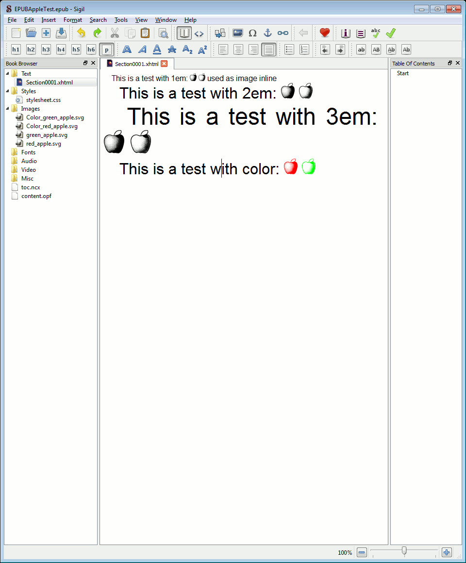 <p>This is a test with the <img class="svg_img" alt="red_apple" src="../Images/red_apple.svg" /> used as image inline</p> ![]() Below you can test my ePub. Regards Rubén Last edited by RbnJrg; 09-22-2013 at 05:04 PM. |