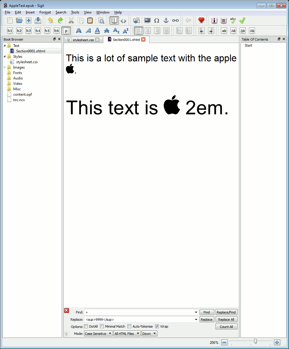 The Apple symbol. Yes, it works in Sigil: I set "height: 1em;" and the symbol is the size I want (just as Text2002ans showed). But as soon as I open the ePub in ADE the Apple gets back to its giant size. And frankly, I have no idea why. The most confusing thing is that when I open Text2002ans's AppleTest.epub in ADE, it works just fine! The Apple symbol is shown at the good size. So I tried to import his exact code in my ePub, same PNG file, copied the CSS and HTML. And it doesn't work anymore! Giant Apple in ADE again... Frankly, this is getting insane. I really have no idea what is causing this. At this point I'm a little desperate. I spent way too much time trying to get this ePub to work this week... Even my other embedded symbols seem to have stopped working in ADE. And my 'Special-character.epub' test file posted on the first page still works fine in ADE, and the fonts are embedded exactly the same way. I can't upload the ePub here because of copyright, but if anyone is curious about this and wants to have a look at it, let me know and I'll send a link in private. Thanks again for all the help. EDIT: Oh and by the way, the AppleTest.epub (with the PNG file) doesn't work in iBooks either. I get giant apples there too... The most frustrating thing is that iBooks is pretty much the only reader where I wouldn't even need to do this: Apple symbols are already embedded in it so the symbol appeared automatically on the first try... Last edited by mtrahan; 09-22-2013 at 01:08 PM. Reason: Another test. |