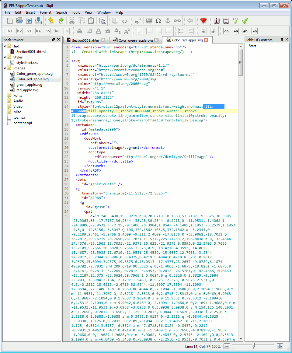 I went in and added the Green Apple (U+1F34F): http://www.fileformat.info/info/unic...reen_apple.svg I also tweaked the SVG file and changed "fill" into the hex for red and green. Sigil: ADE: On Nook: Does this work on Marvin/other devices/reading programs too? Anyone have any of the Kindles on hand? How well does this transfer over? Kindle Unpack shows the SVG files sitting in the KF8 version. According to what I read in the Amazon Publishing Guidelines, I am getting mixed signals (SVG only in Kindle Fire (?)). In section 8.4.2 they recommend using the SVG with an accompanying image. Setting the image to "display:none", and only displaying the image in old MOBI using media queries. UGH: http://kindlegen.s3.amazonaws.com/Am...Guidelines.pdf Not much information though on SVG in their documentation. I also stumbled upon this thread with a formula as SVG, with a sample EPUB plus lots of info: https://www.mobileread.com/forums/showthread.php?t=87781 Now I want to find more complex SVGs and do some testing. ![]() Quote: