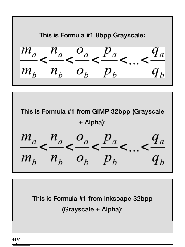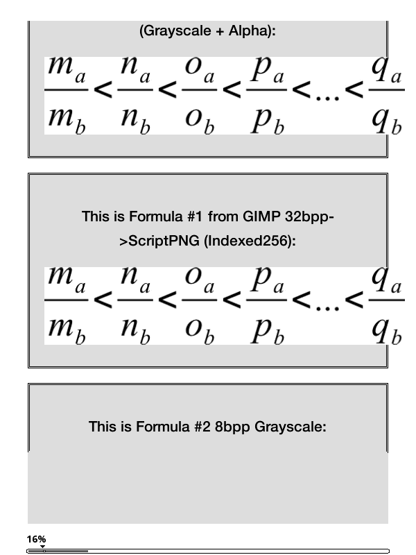 The bug: I believe these images will speak for themselves: On to the causes of the Bug: This is all just educated guesses. I used Imagemagick's "identify -verbose" on all 4 versions of Formula #1 (verbose output attached to this post). After comparing the output closely, I can see that the only major difference between Inkscape's version and GIMP's version is between color type: https://en.wikipedia.org/wiki/Portab...cs#Color_depth Inkscape's is set to 6 (RGB + Alpha) while GIMPs is set to the proper 4 (Grayscale + Alpha). Guess: Perhaps KindleGen can't handle PNG Color Type 4 images? Request: Can someone with a lot more image experience create Grayscale + Alpha images and feed them into KindleGen/Previewer? Perhaps try to create them from a different program besides GIMP (maybe Photoshop, or the multitude of others). Edit: I just tested this on my Nook + ADE, and it seems like ADE likes to break on the ScriptPNG (Indexed + Transparency), but works fine on the others. The causes of this one? No clue, maybe an Indexing + transparency is EXTREMELY rare. I would say avoid Transparency PNGs for now.