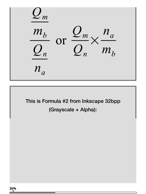 #1. No Transparency (Removed and saved right from GIMP just like the tutorial) (8bpp Grayscale) #2. Transparent formula (Inkscape -> GIMP -> Mode -> Grayscale -> Saved) (32bpp Grayscale) #3. Transparent formula (Inkscape) (32bpp Grayscale) #4. Transparent formula (fed through ScriptPNG to optimize) (Indexed 256) Sadly, I don't have any physical Kindles to test on (I would not trust Kindle Previewer one iota when dealing with situations such as this). Quote: