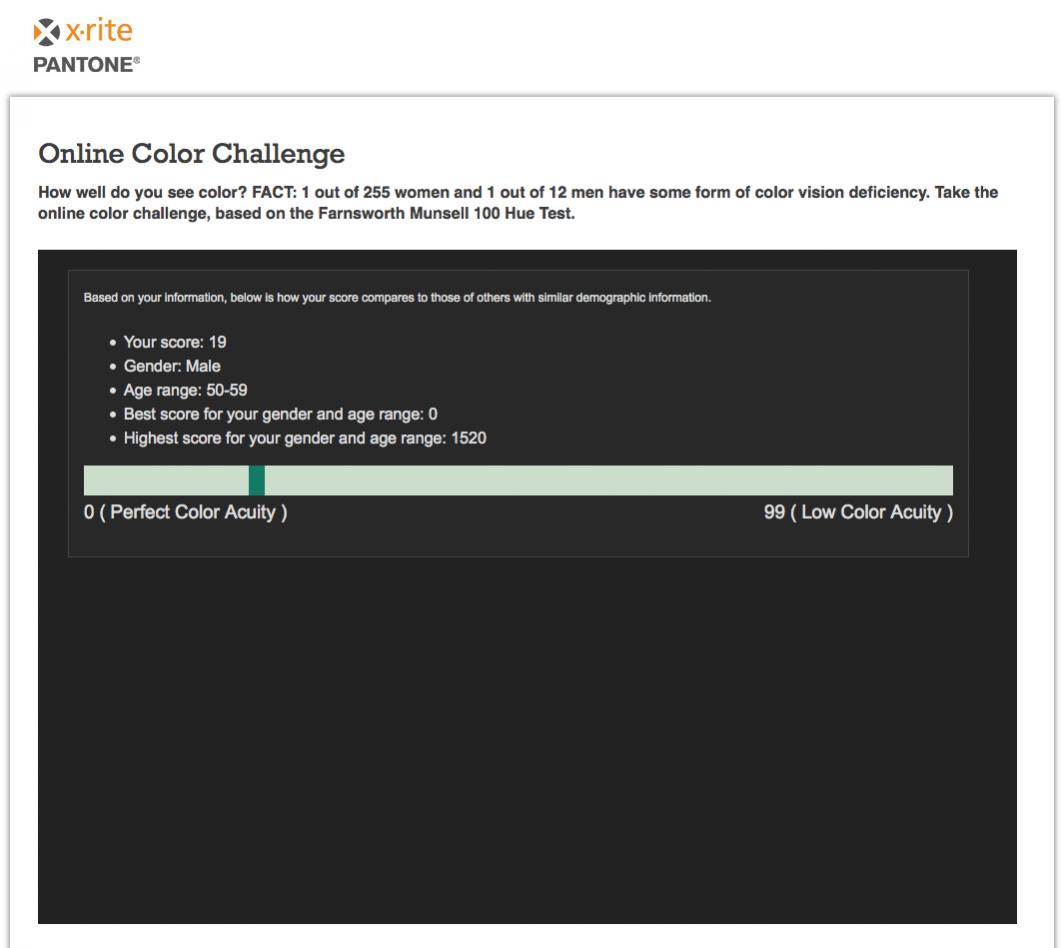 Okay I took the test. Not sure what my results mean, but I think it means my color vision isn't too bad. See attached screenshots.