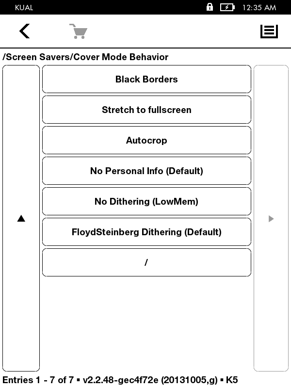 Implement a new cover mode setting: black letterboxing borders. (Drop a blank 'black' file in the linkss folder to enable this mode) Or if you are implementing through KUAL, there is a button in the screensavers menu list to toggle between white and black...white is default. Works great. Last edited by GoSharks; 10-06-2013 at 07:28 PM. |