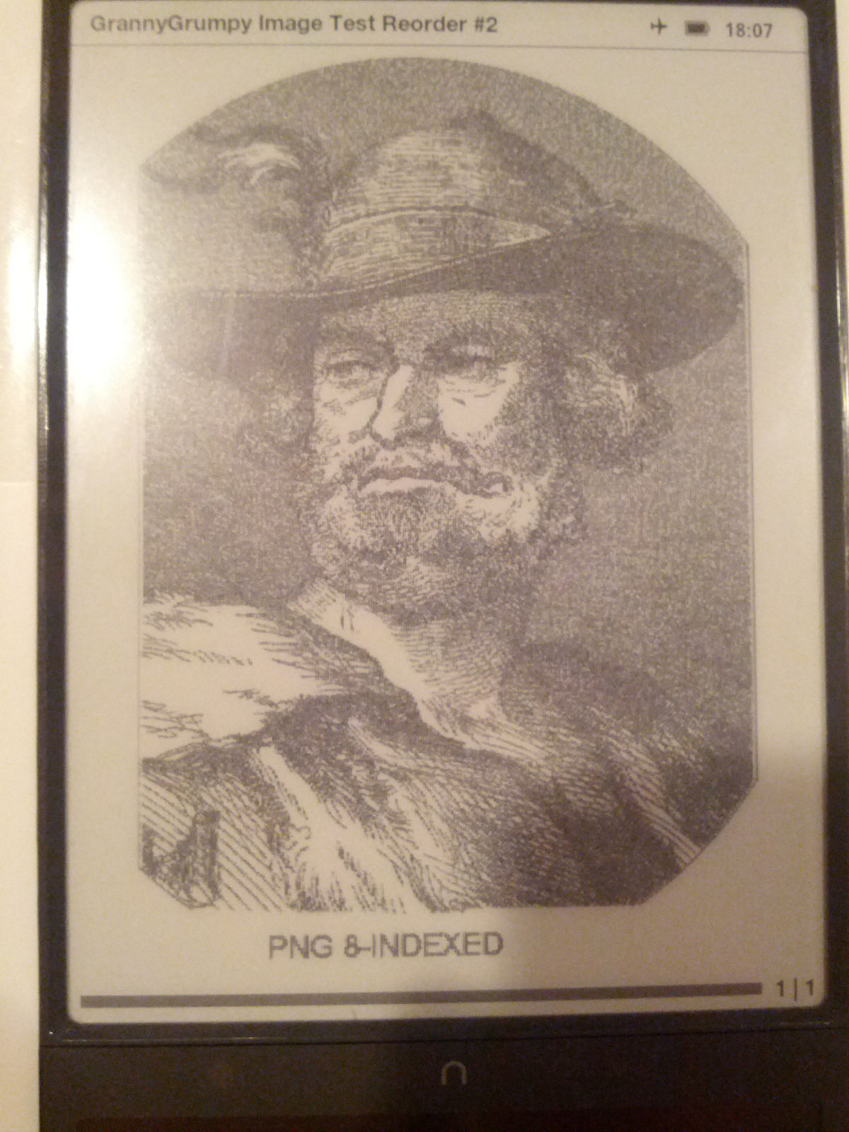 @Tex2002ans --- Just for kicks and grins, here is another test-bed epub with identical images. They are 500px wide x 740 high (30% of the source image). It includes 256-Greyscale (8-bit), 256 indexed palette (8-bit), 16 indexed (4-bit), 8 indexed (3-bit), 4 indexed (2-bit), and 2-color black & white (1-bit), AND, 16-color increased back to 256. (I threw in a couple of jpegs too, just for your viewing pleasure )Once again, ADE for desktop shows everything just fine, but SonyReader for desktop barfs on anything less than 8-bit. ---- Well, not quite, the Sony software display of the 2-color black-and-white image is good. Go figure... Last edited by GrannyGrump; 10-04-2013 at 12:45 AM. |