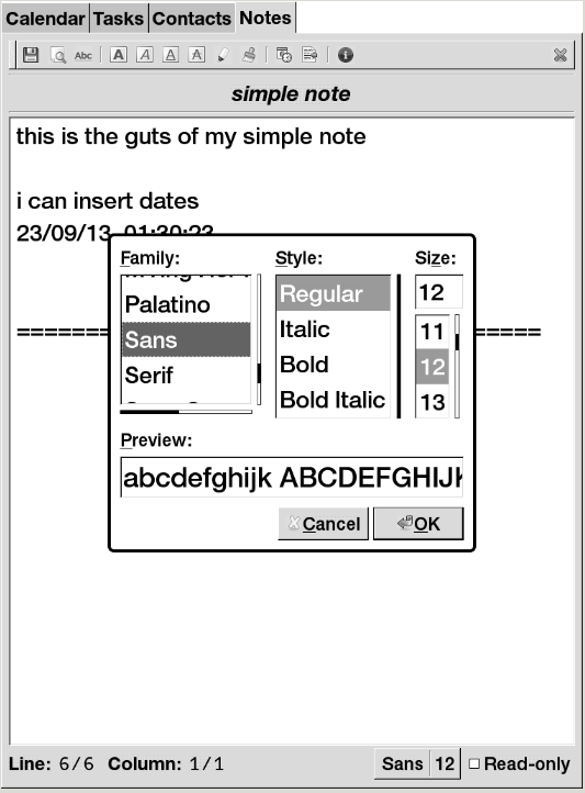 laborious but.. getting there. new improvements: LATEST VERSION: Now building from SVN revision 937 rather than the older debian code. QUIT BUTTON. will now display on all toolbars (regardless of preferences) NATIVE KEYBOARD IN DIALOGS. It's a manual task of identifying every single one that needs one and setting them all up by hand.... The joy. But 1st one now done so... can be done. (and it closes intelligently on dialog closure) TIME DOES NOT TICK EVERY SECOND. This allow for smoother scrolling in the calendar view and saves on pointless screen updates. ABOUT SCREEN CLOSE BUTTON. I moved it to the top for those awkward moments when you manage to launch it accidentally with a keyboard up. (I could have closed the keyboard but that would have meant more end user clicks so...) Anyway. Thought I would report the progress. |