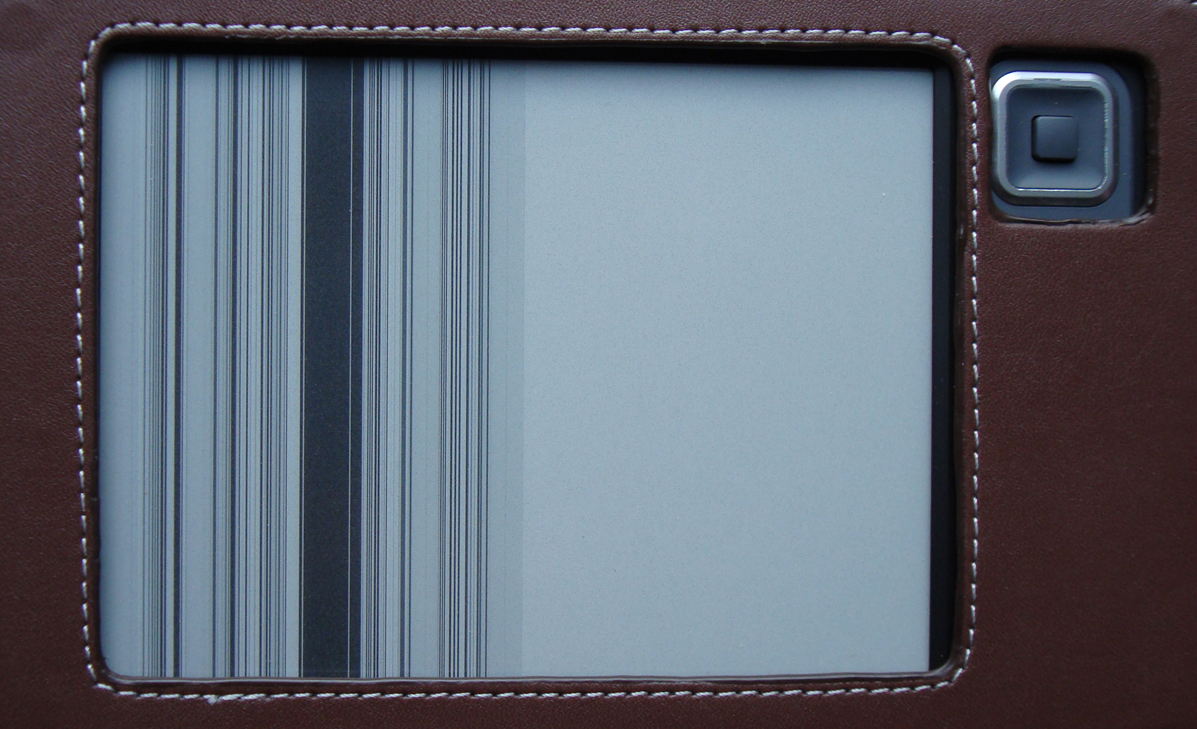 I researched readers before buying, and having seen Harry’s warning about the case being essential, I got the case with the reader and have treated it very, very carefully. It has not left the case except to be charged. It commutes to work with me, but stays in my briefcase when not being used. It has never, ever been dropped or abused in any way. I’m posting a couple of photos. I’ve looked closely at the screen and can see no sign of any breakage, so I’m hoping it is the controller and will be covered by Bookeen. I’ll email them with photos to get an RMA, but does anyone have a suggestion for the best (ie cheap, but still safe) way to send it to France? I live in the Boston, Massachusetts area. Thanks, Gerry |