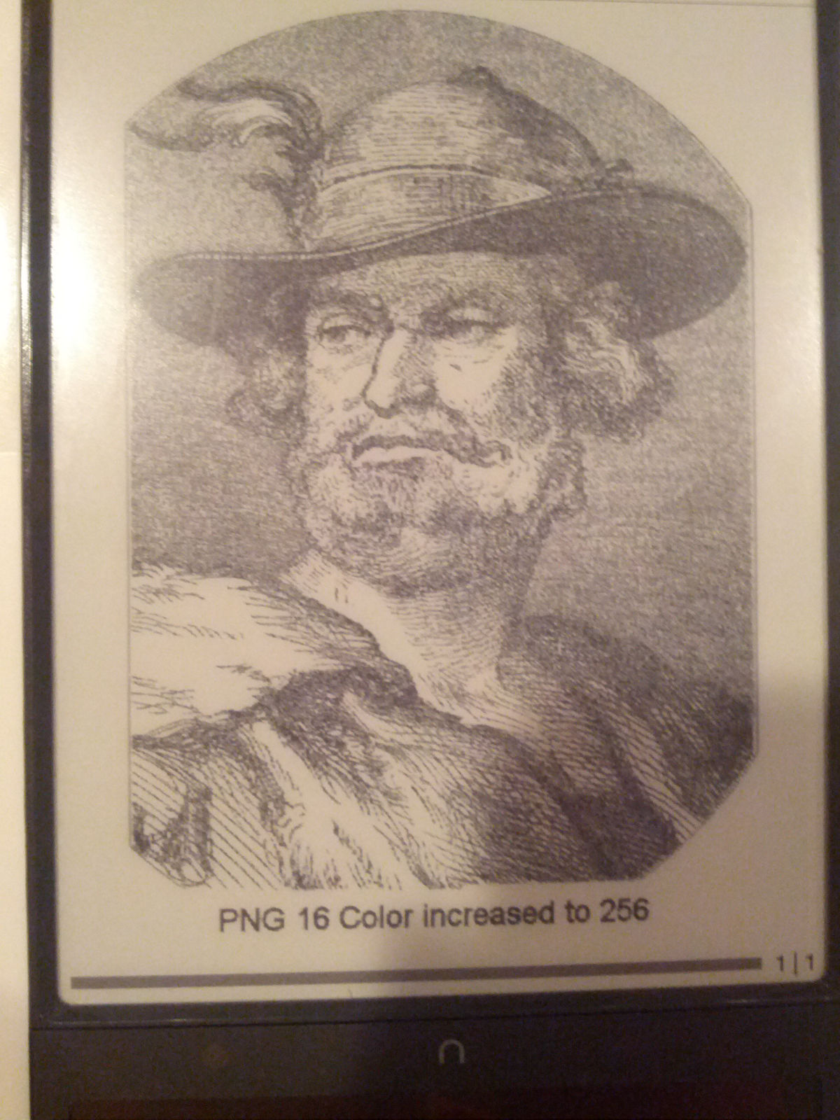 Let me start off with a basic overview of the different bit Grayscale/Indexed PNG: If you are saving as a Grayscale PNG, there is this: 1-bit: 2 shades of gray 2-bit: 4 shades of gray 4-bit: 16 shades of gray 8-bit: 256 shades of gray 16-bit*: 65535 shades of gray * It seems like this is used most commonly when scanning B&W FILM.... don't know the status of this in actual book scanning (or PDFs you find online). Side Note: I have no way of generating these (GIMP doesn't support it), perhaps Photoshop can export 16-bit grayscales? I will have to hunt around and see if I can find examples of these, maybe I can generate one using Imagemagick. I don't know if ADE could handle these, but it would be fun to toss at it and see what happens (Perhaps it turns into a big black box like my Grayscale + Alpha image). Indexed PNGs are a replacement of GIFs, and work on ANY colors: 1-bit: 2 colors 2-bit: 4 colors 4-bit: 16 colors 8-bit: 256 colors 1-bit and 8-bit are the most common. 2-bit PNGs seem to have poor/wrong/non-existent implementation in a lot of programs. GIMP seems to output 2-bit and 4-bit correctly. If the image program is competent, it should select the proper n-bit for the amount of colors. <= 2 colors should be 1-bit 3-4 colors should be 2-bit 5-16 colors should be 4-bit 17-256 colors should be 8-bit Side Note: They probably just got lazy and decided to cut down on logic, and only care about 1-bit B/W (think book scans) or 8-bit Grayscale/Indexed. 8-bit encompasses all below, but would just be slightly more bloated than it COULD be. NOTES on the Test EPUB: Side Note: Next time, just use zero text appended to the bottom, this means that it will be the SAME EXACT IMAGE, but the only variable thing changing is the different settings. You can always add the explaining text in the EPUB between sets of pictures + relevant filenames. ![]() I used imagemagick's "identify -verbose" command to take a close look: - Your "2-bit" image is actually saved as a 4-bit image (could be non-existent support for 2-bit PNG in PaintShop Pro). - Your "3-bit" image is actually a 4-bit image (no such thing as 3-bit lol) - Your 16->256 is saved as an 8-bit image. - All the others are saved as the correct bit. GIMP: - 2 color image saved properly as 1-bit. - 4 color image saved properly as 2-bit. - 16 color image saved properly as 4-bit. - 256 color image saved as 8-bit. Testing on my Nook: - In the 16->256->16 section. -- The only difference is bit-depth (PaintShopPro = 8-bit, GIMP+ScriptPNG = proper 4-bit). -- My Nook shows weird artifacts (looks like speckling) on the 4-bit images. - In the Indexed 8 color section, for some weird reason the GIMP version looks EXTRA HORRENDOUS. -- Your version + ScriptPNG versions look speckled, but otherwise the same. -- This is odd because they are all 4-bit, so I would have expected that all three would look horrible... so I have no clue. - There is weird degradation in your image reduced to 16 colors, there is no degradation in the GIMP 16 color version. -- This is also odd. My Image Test EPUB: OF COURSE I can't get the problem to replicate in my test EPUB consistently NOW... (those gremlins are out to get me lol). But the PNG I was able to get to break was the 2-bit elementof PNG compressed through ScriptPNG: Here is the problem as I first ran into it in the QJAE (EPUB is attached): My best guess is... ADE has a bug with 2 and 4-bit PNGs. The "banding" issue is happening on your images, but it is just VERY HARD to tell because of the nature of a photographic image. In my formulas it is much easier to see the bug because there are large swaths of solid color. Without access to ADE source code, I have no clue exactly what the problem is. I will continue to poke around at the different images with imagemagick... hopefully between comparing all of these different images, I can stumble upon SOME difference. Maybe ADE is ASSUMING 1-bit/8-bit but is ALSO looking at the amount of colors in the PNG, if it falls into those in between ranges, maybe ADE blows up (The amount of colors are saying it should fall into "2-bit/4-bit" while another part of code is forcing it into 8-bit mode?). This bug COULD have been fixed on a newer version of ADE... could anyone test all of this on a newer e-ink device? Side Note: Days of work has gone into this. I was reading all this in depth PNG documentation, now time for my brain to explode. ![]() Edit: Quote: