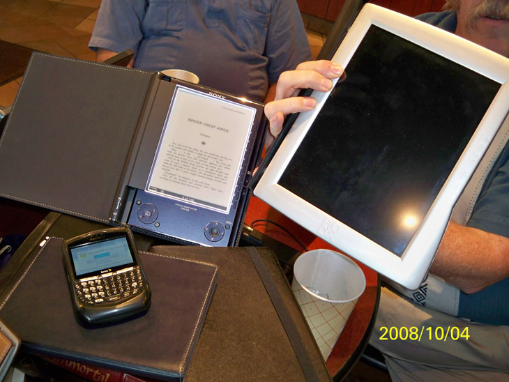 Okay, I recognize the Sony (which to me, by the way, looks better with the lighted book cover than the sourcey side lighting of the 700). Which reader is that with "Book" (I think) on the bottom?
