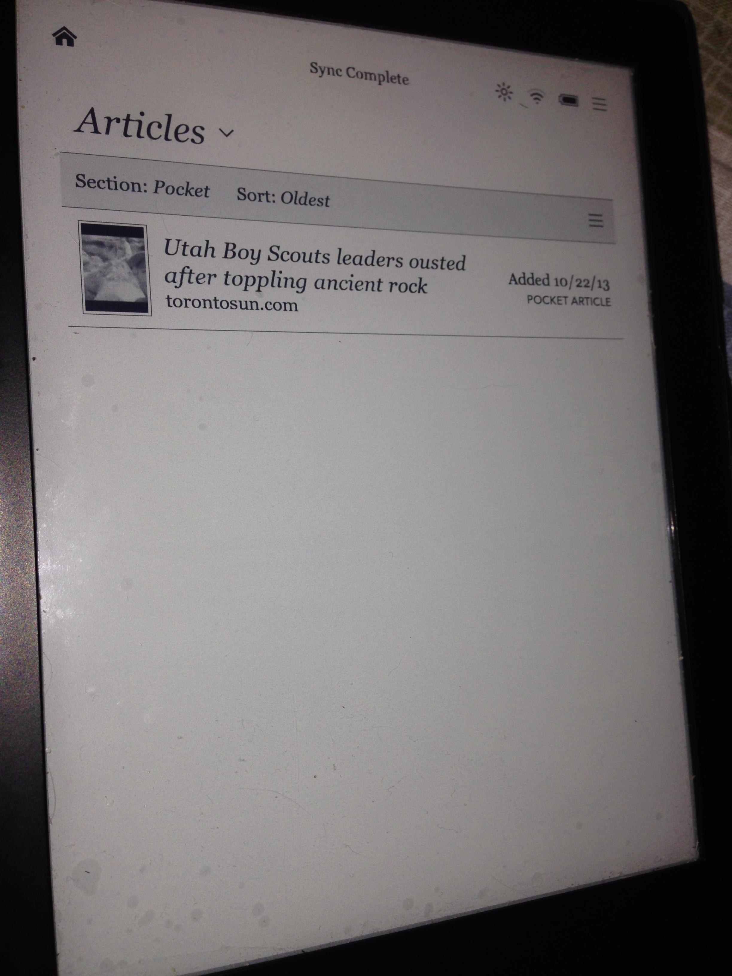 Yes I can provide links.. This link here did not create a viable article....VVVVVVVVVVVVVVVVV http://www.thestar.com/life/health_w...ur_health.html using the email method or by using the suggested method that pocket suggested. This link here created a viable article.VVVVVVVVVVVVVV http://www.torontosun.com/2013/10/21...g-ancient-rock ok so here is the image of the pocket page.. the first square is the last link the second and third square are two efforts of saving the articles suggested by pocket. hopefully my 47 inch computer screen shows up ok. the second image is the aura with the one good article creation... the bubbles are just the original screen covering the Aura Hd was shipped with haven't got around to replacing it with a good screen protector regards. Jack Last edited by jackastor; 10-22-2013 at 08:15 PM. |