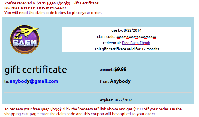 For those new to this: When you purchase a month's bundle, Baen allows you to gift a certificate worth $9.99 to someone that does not have an account.