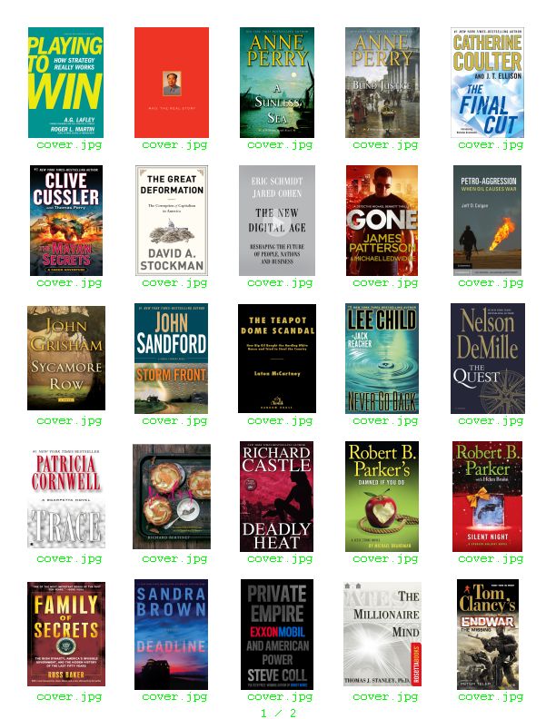 Ok so you have a library of well over a thousand books, wouldn't it be usefull if there was some software out there that would extract all of the title pages as jpeg's and dump them in a folder so that a catalogue could be made of all the front covers, very nice for browsing and choosing the next book to read.