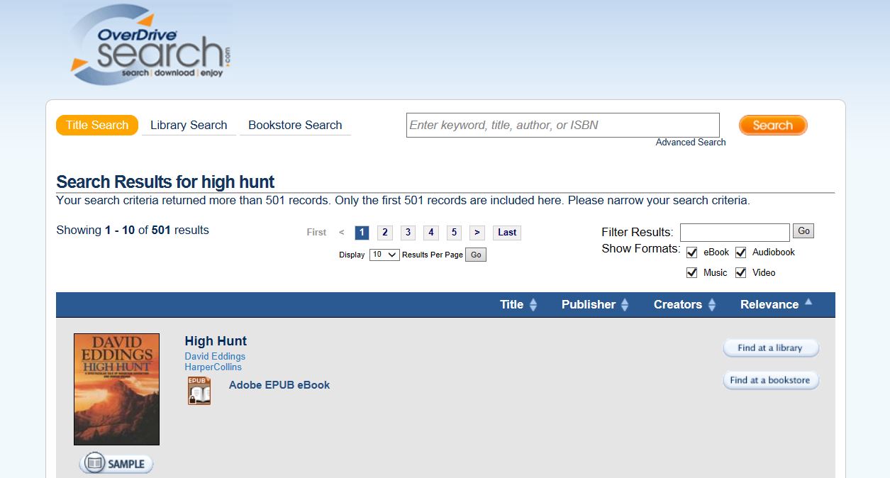 Second, I give you an example of the following book where no links were found, but it IS shown on the Overdrive.com web site (pic attached) as available at a (some) Library. High Hunt by David Eddings