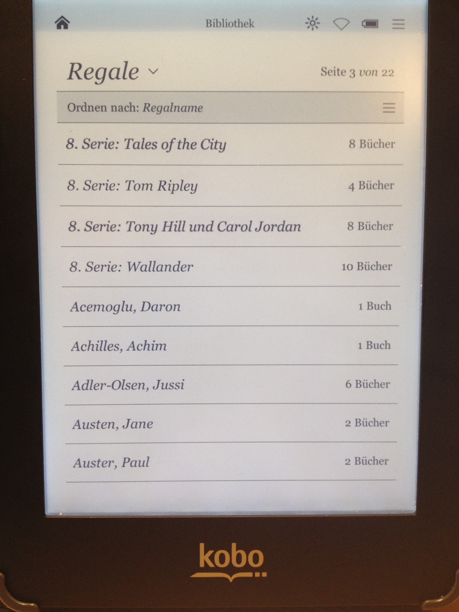 I created two custom columns in Calibre. 1. custom column = regal (this is used to get a collection for different genres) program: $=field('tags'); first_non_empty( contains($,'Roman','1. Romane',''), contains($,'Krimi & Thriller','2. Krimi & Thriller',''), contains($,'Novelle & Erzählung','3. Novellen & Erzählungen',''), contains($,'Lyrik','4. Gedichte',''), contains($,'Drama','5. Dramen',''), contains($,'Märchen','6. Märchen',''), contains($,'Sachbuch','7. Sachbücher','') ) 2. custom column = serie_kobo {series:| 8. Serie: |} The KoboTouchExtended plugin is configured “collections: authors, #regal, #serie_kobo” When I open the library by choosing collections I get on the first page the genre collections “1. Romane” to “7. Sachbücher”, followed by collection “8. Series: AAA, 8. Series: BBB, 8. Series: CCC” and so on. After the “8. Series: XYX” collections the authors with their books are shown, no matter of genre or within a series. In your case, you only need the second custom column and change the prefix of the series in “1. Series:” To get a better impression look at the pictures of the first four pages of my library. Maybe this is a solution for you and your mother. |