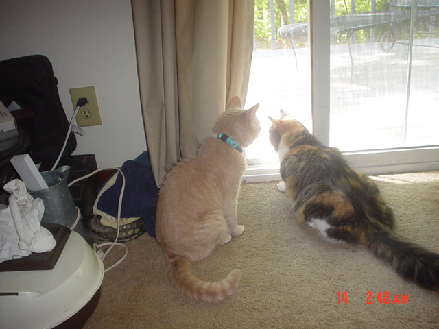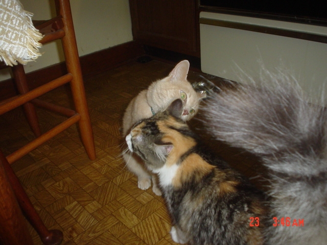 So .... Goldie cat is the smallest of our cats - apparently had an abusive kittenhood with little socialization with people - when we adopted her she displayed "please don't kill me" cringing behaviors but very little trust. Didn't want to be held, didn't socialize well with people, but got along with the other cats. So we let her develop at her own speed and she eventually became a snuggly lap cat (finally!) that boldly claimed the bed next to my right side as her sleeping area. But she remained largely a 'watcher' rather than a participant in human/cat playtime activities. When we acquired Stella, Goldie began to develop an outgoing personality and became more and more active. Sometimes frighteningly so. Which leads to last night .... Our living room has a cathedral ceiling. There is a built in 3 section wall unit of shelving along one wall for knick-knacks, TV, etc. The top of the unit is at least 7-8 feet above floor level. We added a DVD cabinet along one side of it - which is Stella's favorite hang out. None of our cats has ever attempted to jump to the top of the wall unit - or even seemed to notice it. But last night, tiny Goldie effortlessly floated to the top of the DVD cabinet and onto the top of the wall unit without pausing. We had never seen Goldie on top of the DVD cabinet ever! Only Stella. I dropped everything and ran to the wall unit, looking for a chair to climb on to 'rescue' poor Goldie - who must be terrified by the height ... right? Wrong! She trotted along the top of the 3 units, watching my panicked approach ... and then floated soundlessly down onto the DVD cabinet to the floor .... and ran to the kitchen for a reward of treats. Goldie has a congenital heart condition .... but it was my heart that was hammering its way out of my ribs. If she pulls any more stunts, it's going to kill me. Our little girl has grown up! And become a cat!