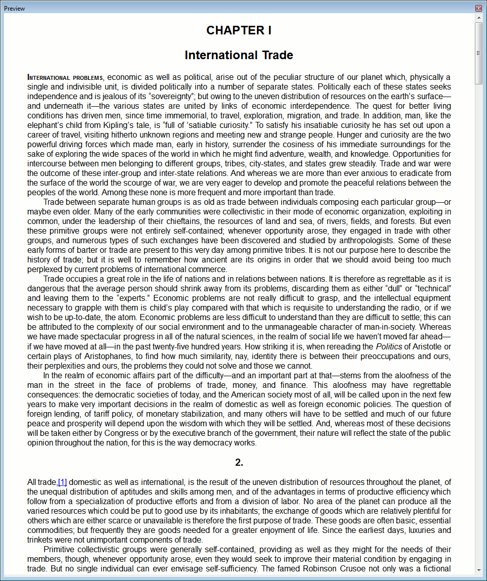 <p class="noindent"><span class="smallcaps">International problems</span>, economic as well as political, arise out of the peculiar structure of our planet which, physically a single and indivisible unit, is divided politically into a number of separate states. Politically each of these states seeks independence and is jealous of its “sovereignty”; but owing to the uneven distribution of resources on the earth’s surface—and underneath it—the various states are united by links of economic interdependence. The quest for better living conditions has driven men, since time immemorial, to travel, exploration, migration, and trade. In addition, man, like the elephant’s child from Kipling’s tale, is “full of ’satiable curiosity.” To satisfy his insatiable curiosity he has set out upon a career of travel, visiting hitherto unknown regions and meeting new and strange people. Hunger and curiosity are the two powerful driving forces which made man, early in history, surrender the cosiness of his immediate surroundings for the sake of exploring the wide spaces of the world in which he might find adventure, wealth, and knowledge. Opportunities for intercourse between men belonging to different groups, tribes, city-states, and states grew steadily. Trade and war were the outcome of these inter-group and inter-state relations. And whereas we are more than ever anxious to eradicate from the surface of the world the scourge of war, we are very eager to develop and promote the peaceful relations between the peoples of the world. Among these none is more frequent and more important than trade.</p> I think that simple code is much more maintainable in the long-run, than a tangle of hideous spans. Future formats/devices/reading programs will be able to handle font-variant, and I think the bold+smallcaps code degrades gracefully. Last edited by Tex2002ans; 11-09-2013 at 01:08 AM. |